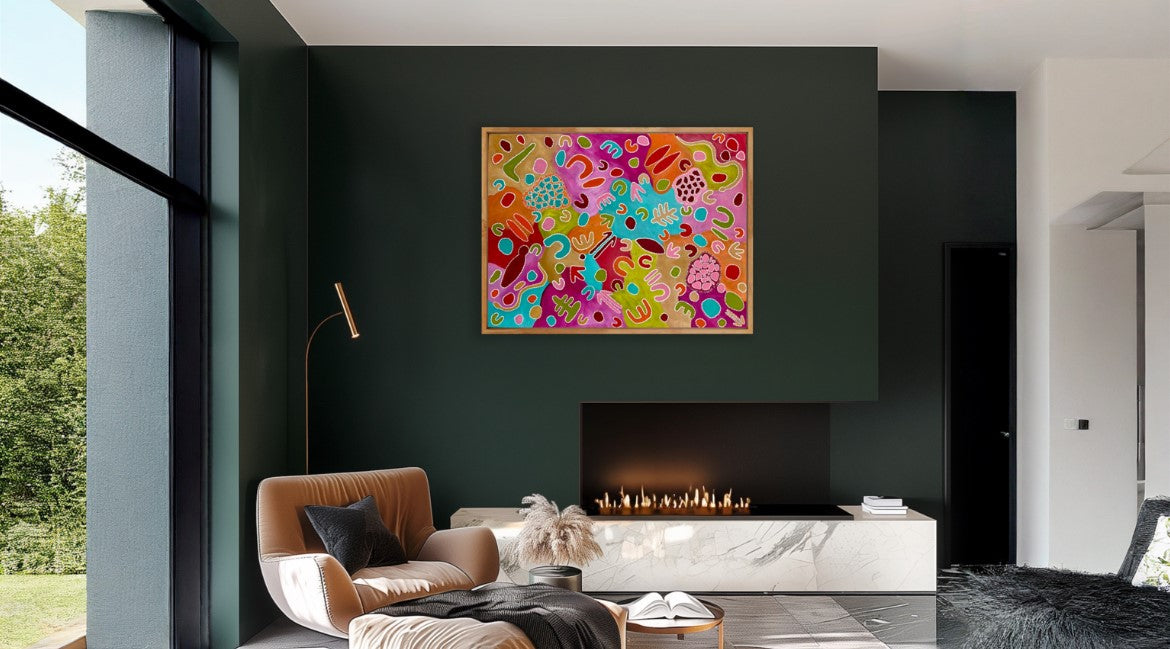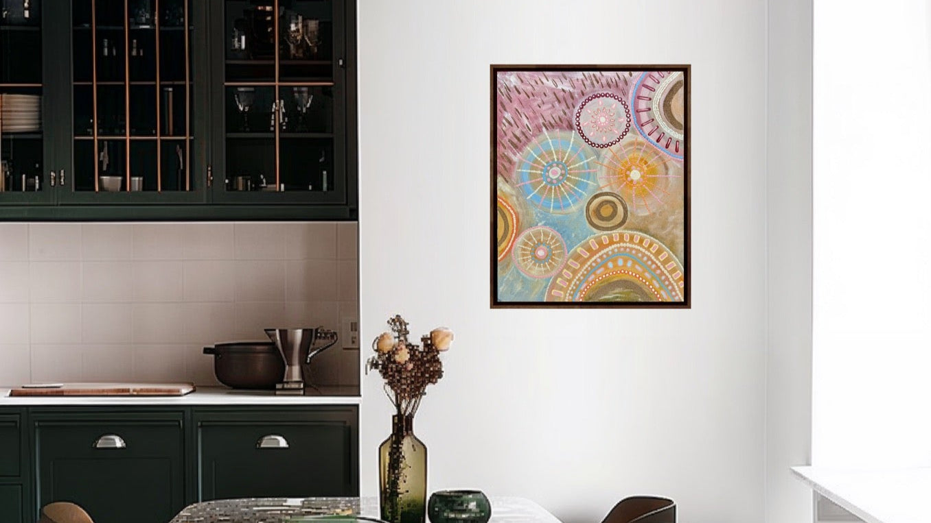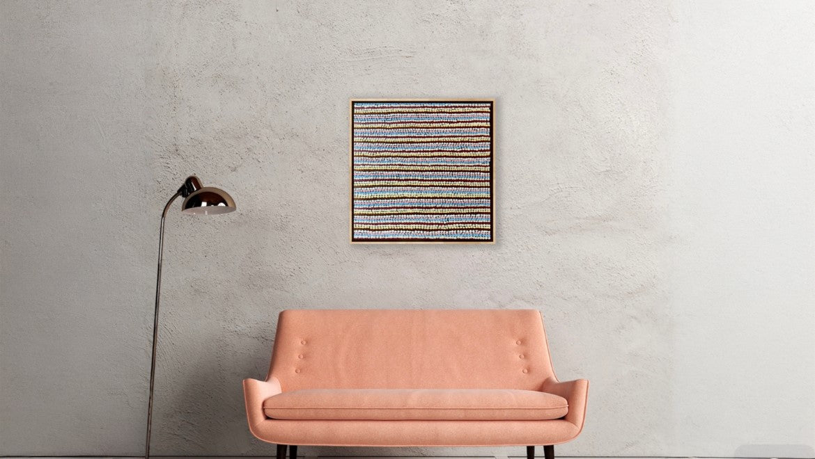 Read MoreEach piece provides a uniquely modern approach to sharing Aboriginal culture, reflected in the use of soft environmental paint colours alongside vibrant modern palettes. The use of varied dot sizes and line patterns creates diverse textures throughout.