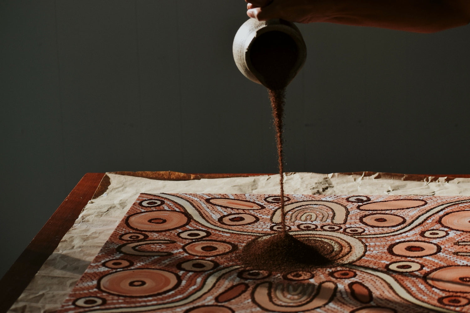 Maloga (sand) is used in some of my works to connect us with mother nature. This unique sand art style has been passed down through my mother's history and it is a style I endeavour to continue to use in my works.